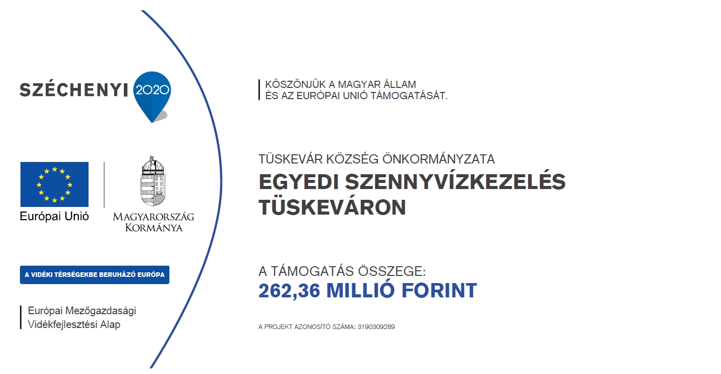 Európai Uniós forrás segítségével egyedi szennyvízkezelő rendszer kiépítésére került sor Tüskevár községben, a Vidékfejlesztési Program - Egyedi szennyvízkezelés elnevezésű - VP-6-7.2.1.2-16 kódszámú pályázat keretén belül 262 357 163 Forint támogatásban részesült.